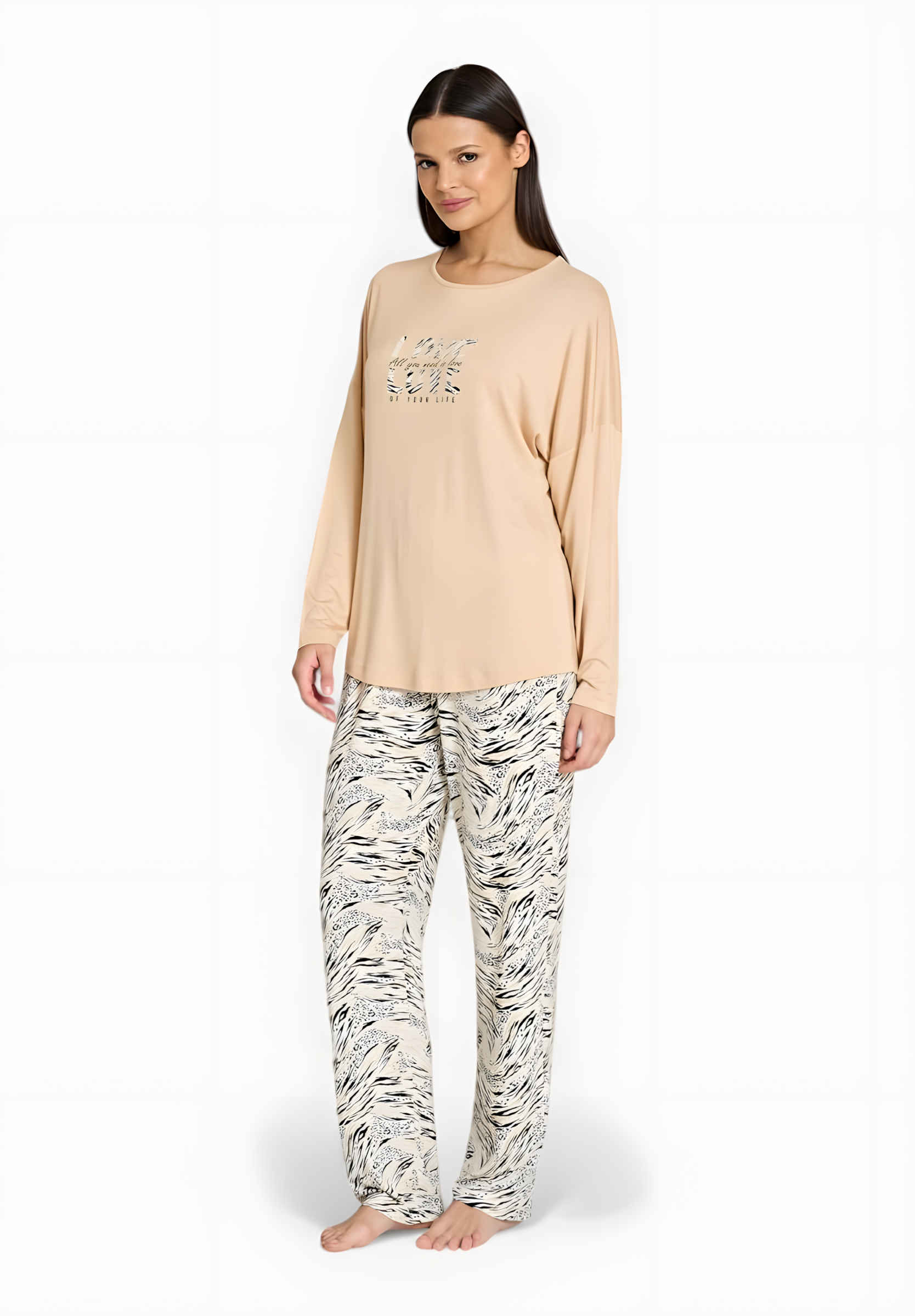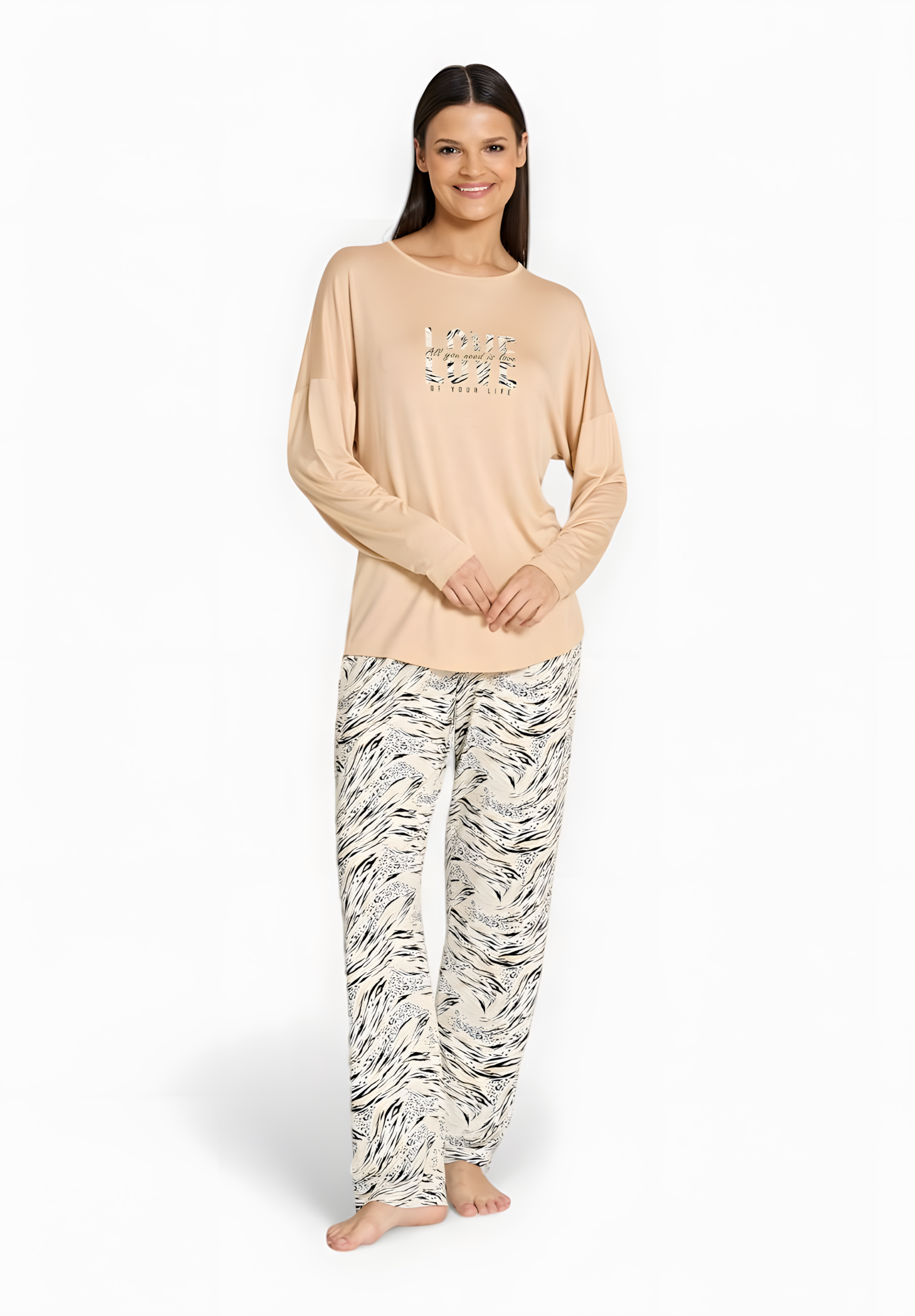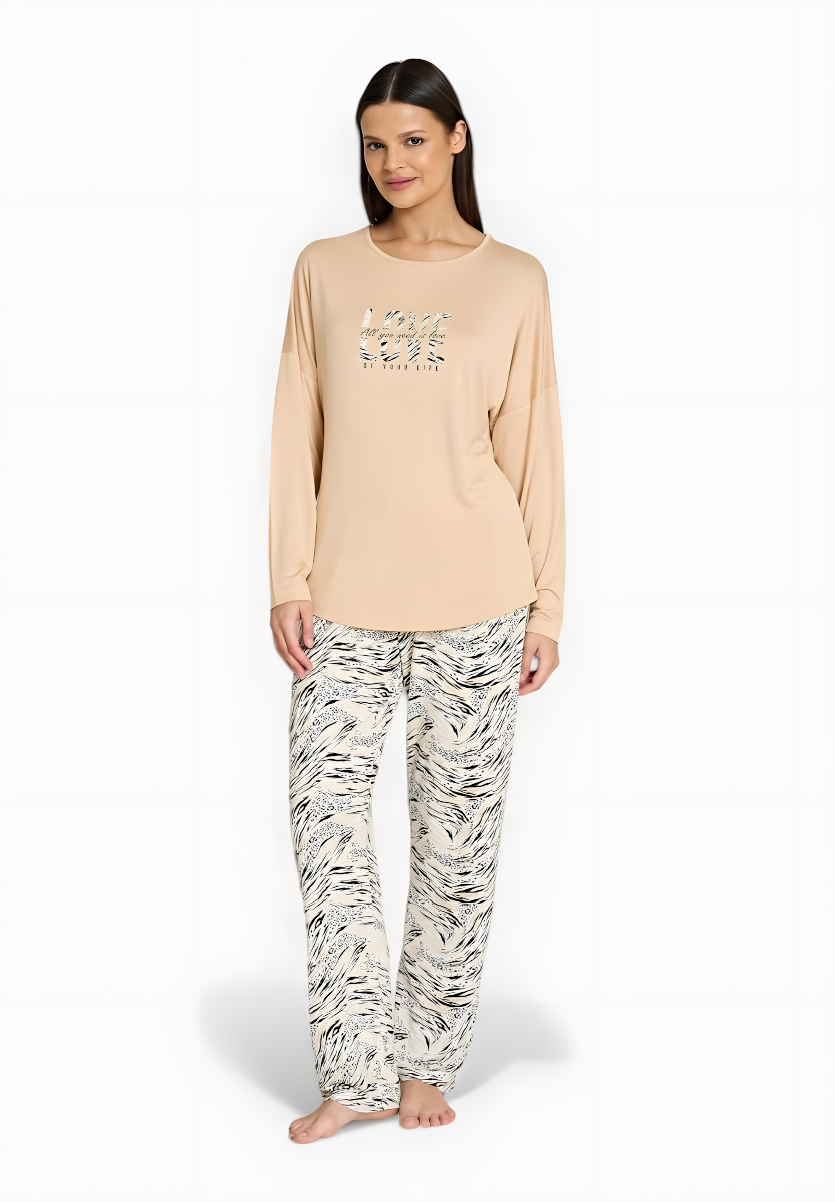 - Pijamasetet kombinerar elegans med den avslappnade känsla du förtjänar. Den långärmade toppen med det unika trycket "Love of Your Life" matchas perfekt med de iögonfallande byxorna i animal print. Ett set att älska – både för natten och för mysiga stunder hemma.