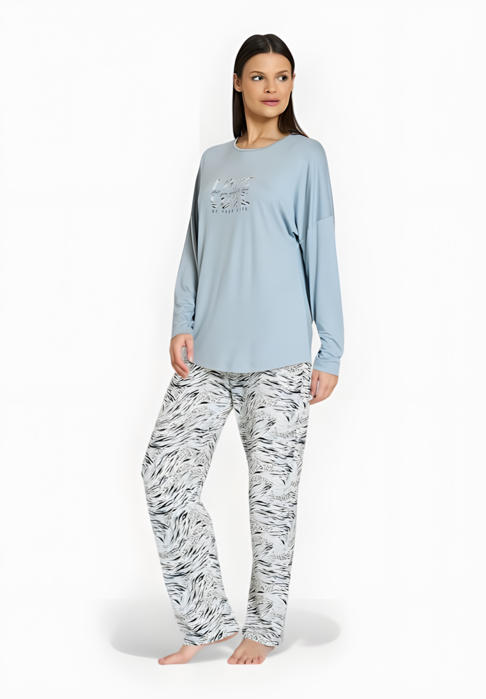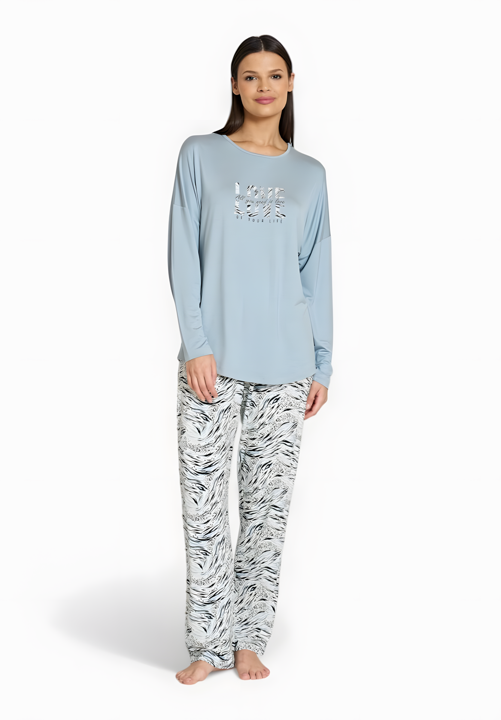- Pijamasetet kombinerar elegans med den avslappnade känsla du förtjänar. Den långärmade toppen med det unika trycket "Love of Your Life" matchas perfekt med de iögonfallande byxorna i animal print. Ett set att älska – både för natten och för mysiga stunder hemma.