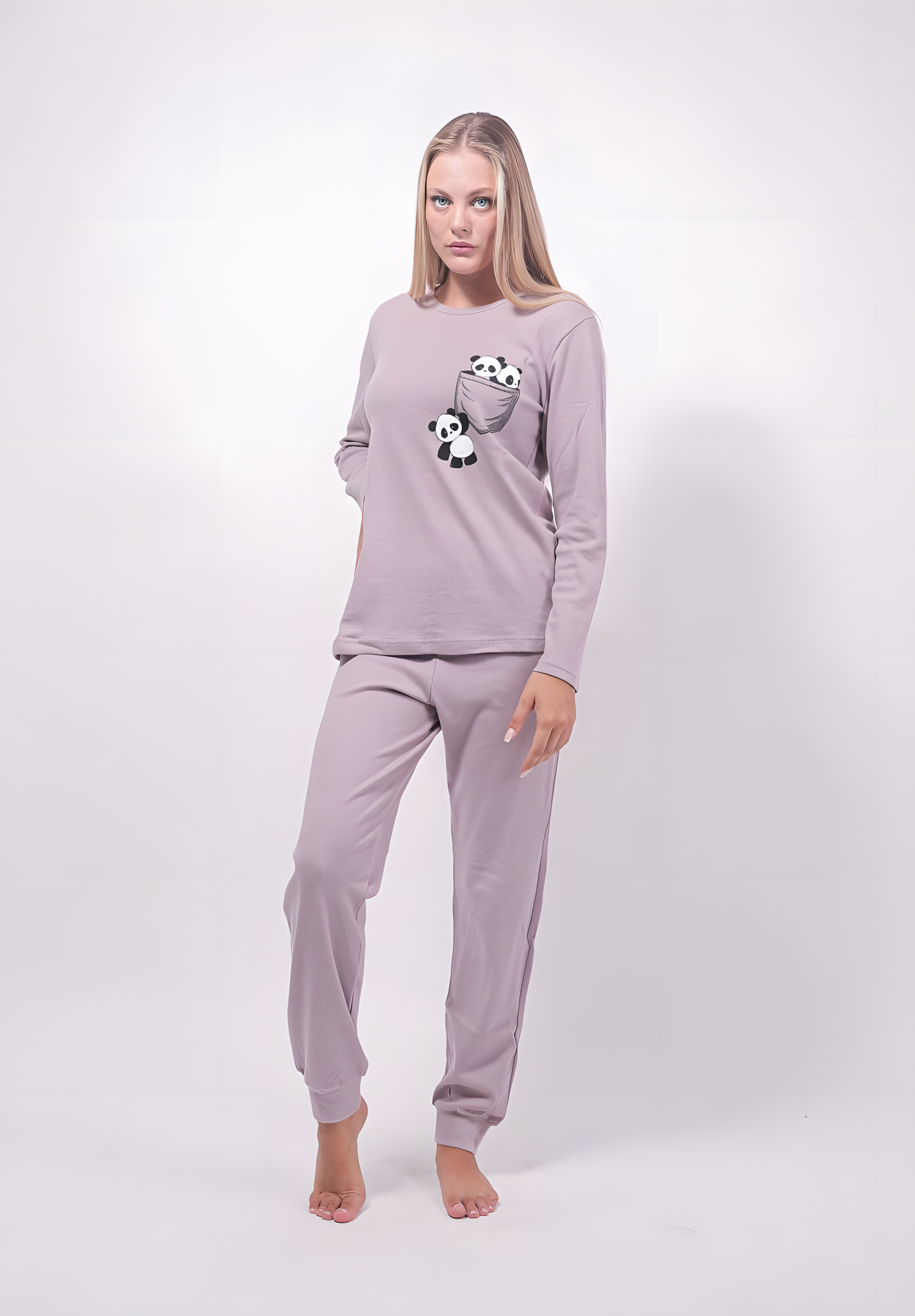 - Upplev komfort och stil med vårt underbara pyjamaset "Panda Love". Tillverkat av 100% bomull, erbjuder detta pyjamasset en mjuk och behaglig känsla som gör sömnen ännu mer avkopplande. Det söta panda-mönstret ger en lekfull touch samtidigt som det är perfekt för mysiga kvällar hemma. Den lösa passformen gör att du kan röra dig fritt, oavsett om du sover eller kopplar av på soffan.